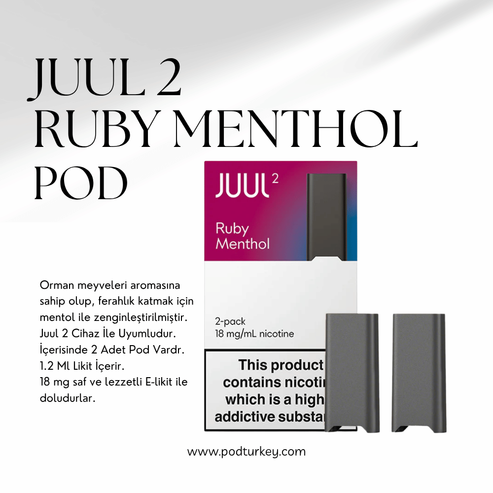 Yeni model olan Juul 2 Starter Kit cihazlar için üretilen Juul 2 Pod Kartuşların yeni serisi Juul 2 Ruby Menthol şimdi Pod Turkey stoklarında yerini almış bulunuyor. Karışık meyvelerin serin menthol ile harmanlandığı bu özel seriye bayılacaksınız. Lütfen unutmayın. Bu ürün sayfamızda yer alan Ruby Menthol 2’li Pod kartuş sadece ama sadece Juul 2 Cihazlar için üretilmiştir. Klasik Juul cihazlar için uygun değildir.