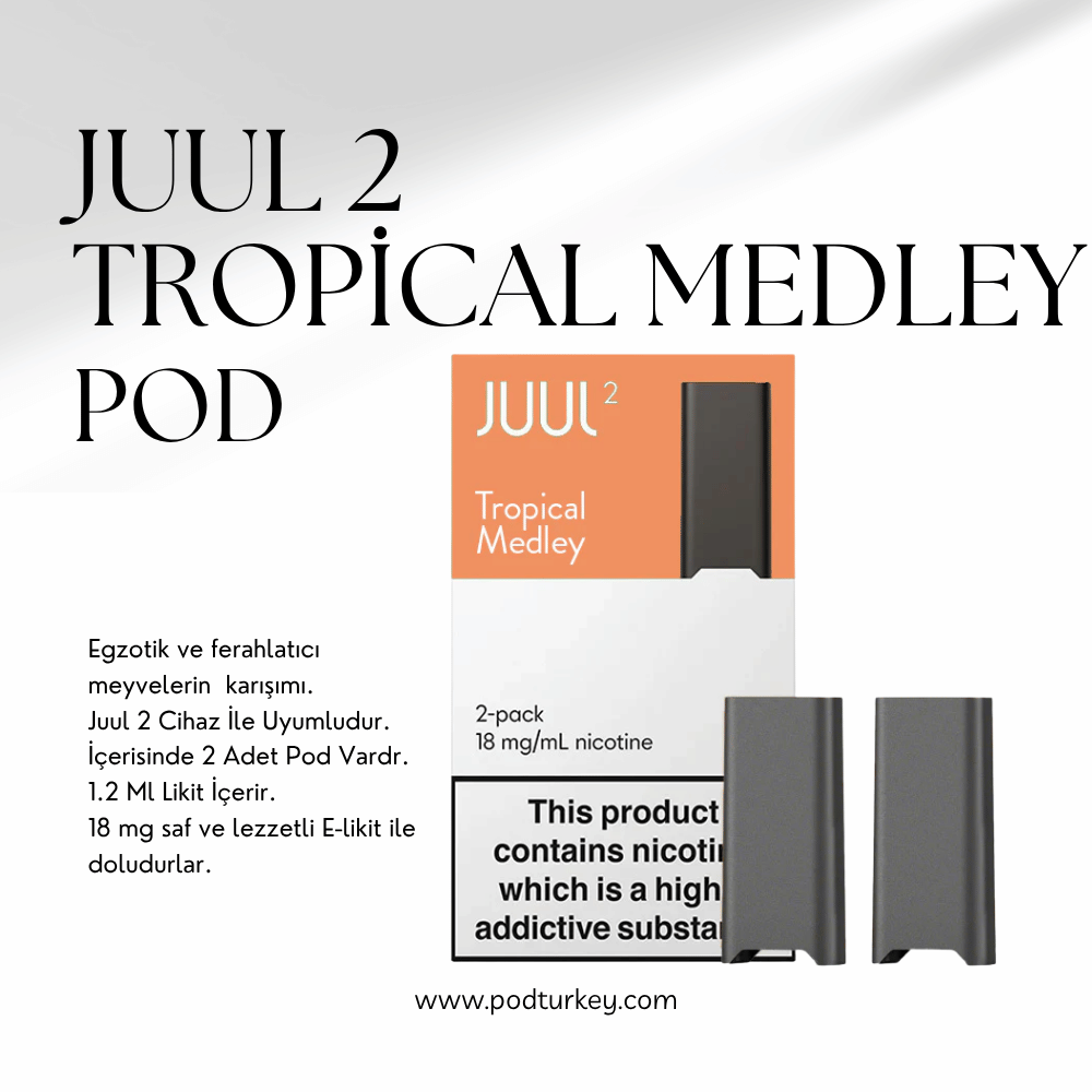 Juul 2 Tropical Medley Pod, egzotik meyvelerin canlı bir karışımı ve yumuşak bir bitişe sahip. Sulu, ferahlatıcı ve çoğu meyveli karışımdan daha kolay içimli.