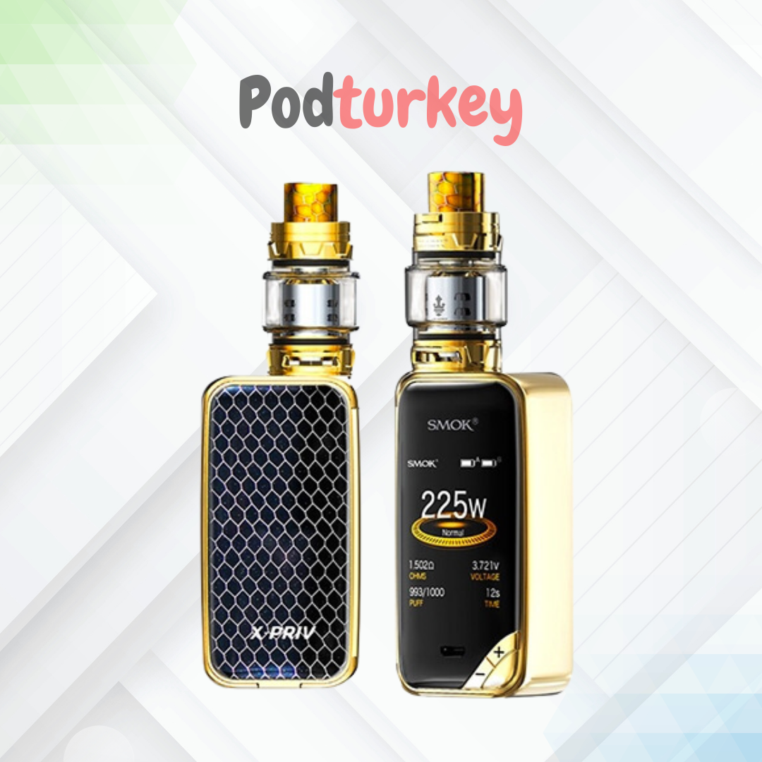 Karşınızda Smok X Priv Kit. Podturkey stoklarında yer alan bu ürüne sahip olmak için tek yapmanız gereken havale veya kapıda ödeme seçeneği ile sipariş vermek. SMOK X-PRIV 225W Pod Kit, son zamanlarda piyasaya sürülen TFV12 Prince Sub-Ohm Atomizer ile eşleştirmek için son derece özelleştirilebilir teknolojiye sahip güzel bir ekran odaklı yapı aygıtı sunan , son derece popüler PRIV serisinin son takipidir . X-PRIV 225W Kutu Mod, SMOK’un en yaratıcı tasarım öğelerinin bazılarını entegre etmek için büyük OLED ekranın etrafına odaklanmış görsel olarak çarpıcı bir şasi tasarladı. Şasi, zamansız bir parça oluşturmak için çok çeşitli renkli kaplamalarda son teknoloji izlenimi veren eğrilik hatlarına sahiptir. Çift yüksek-amper 18650 pil ile güçlendirilmiştir. SMOK X-PRIV, 225W’lık maksimum ateşleme gücüne ve artırılmış hassasiyet için ilave Bellek Moduna sahip sıcaklık kontrol setinden ve tam koruma özelliklerinden oluşan çok sayıda çıkış ayarına sahiptir.