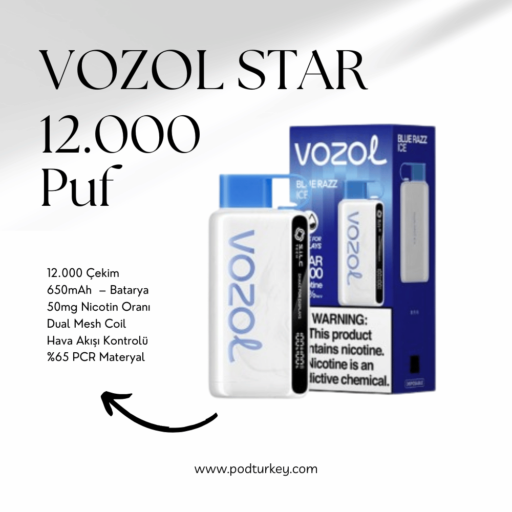 Vozol puff bar markası, STAR serisinin yeni üyesi olan Vozol STAR 12000 puff kullan at elektronik sigara modeli Pod Turkey sitemizde yer almaktadır. Zengin aroma çeşitlerine sahip olan ve Vozol kullanıcılar tarafından büyük bir beğeni ile karşılanan led ekrarnlı dijital göstergeli Vozol Star Dijital 12000 ürüne indirimli fiyat imkanı ile sahip olabilirsiniz. Kapıda ödeme imkanı, hızlı teslimat ve İstanbul içi aynı gün motorlu kurye ile gönderilmektedir.